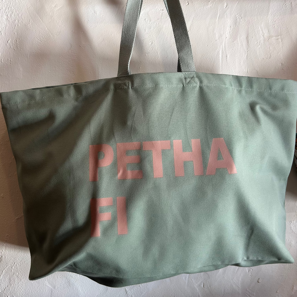 Our extra large personalised tote bag saying 'petha fi' which is 'my stuff' in Welsh.