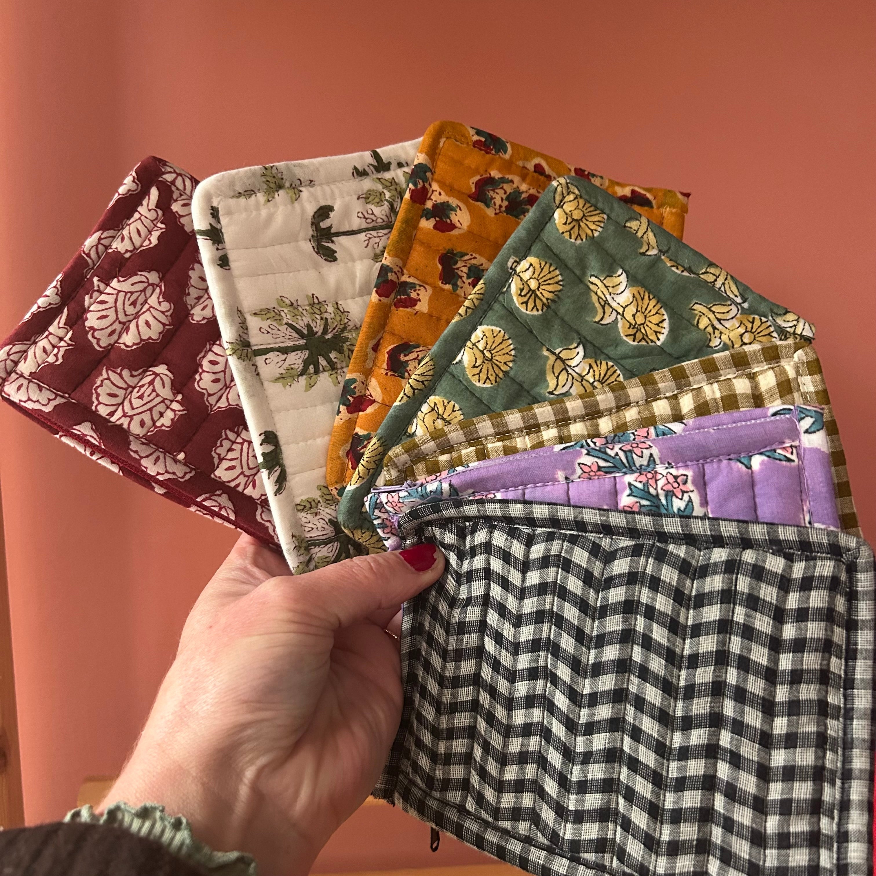 Hand stitched in Jaipur, India. Each one has a zip close.