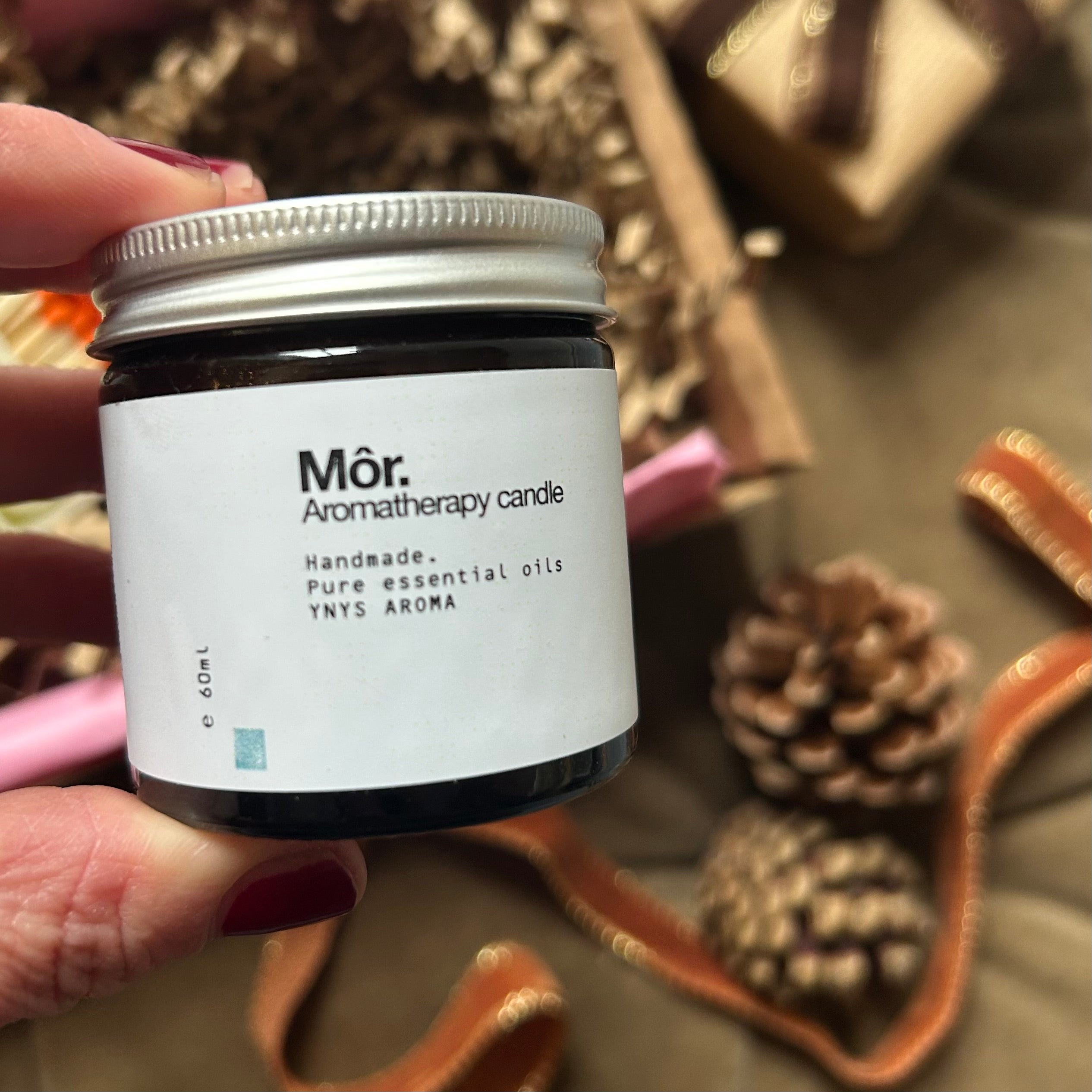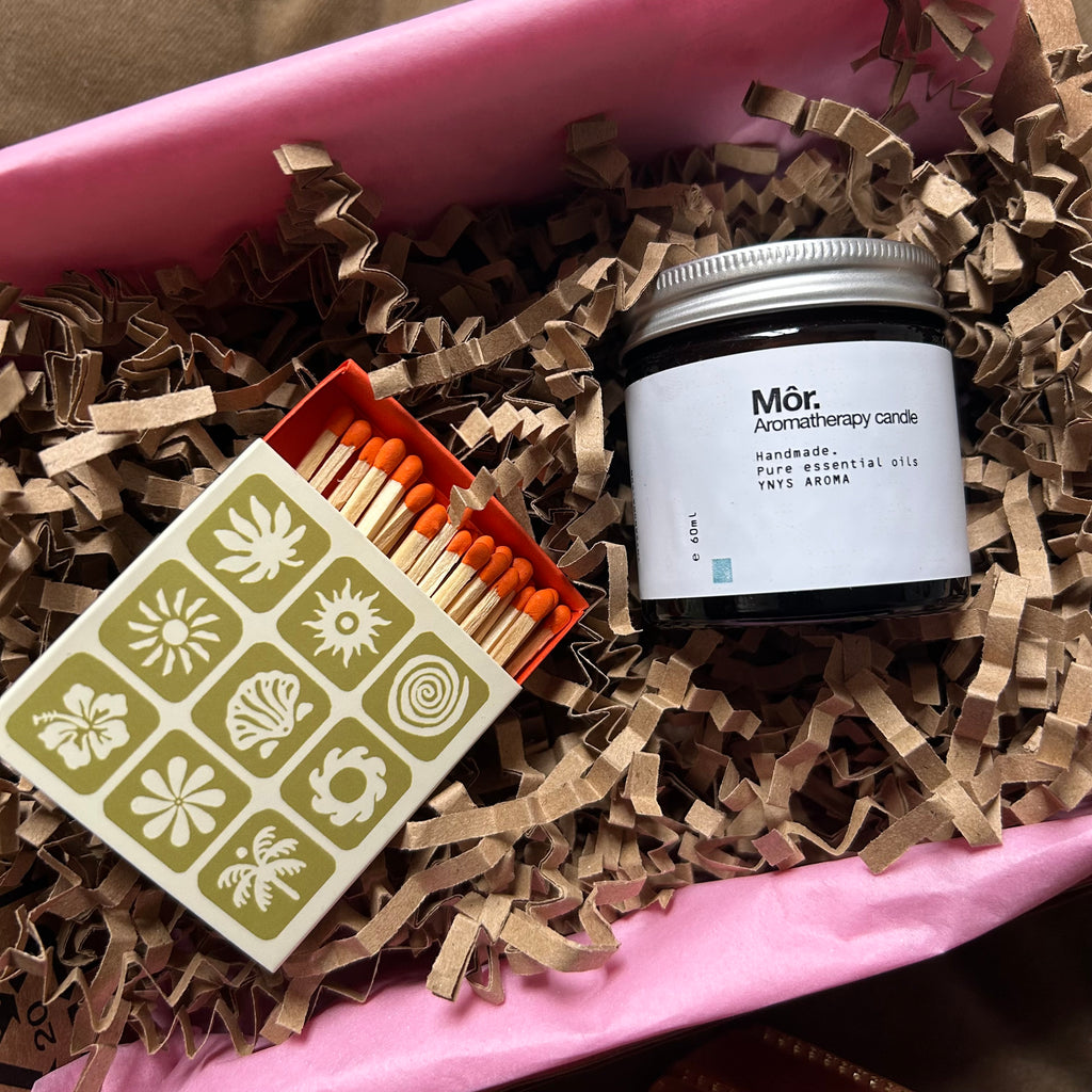 Enclosed is a beautiful Welsh mini aromatherapy candle in our favourite scent of the sea. Each one is labelled Môr which is Welsh for sea. Alongside each candle is a mini box of matches with a pretty design.