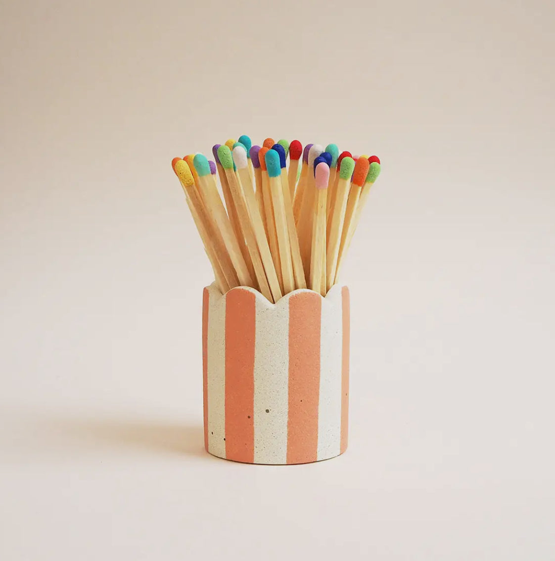 Each pot comes with some rainbow matches and a strike disc (on the base). Each pot measures around 6cm tall and 5cm wide.