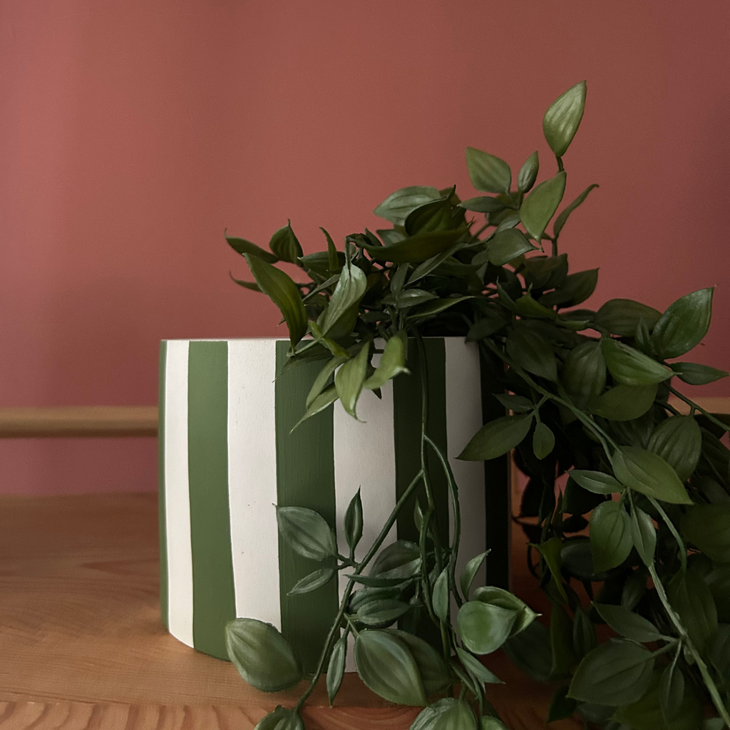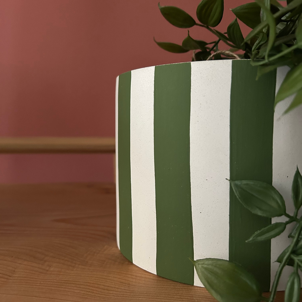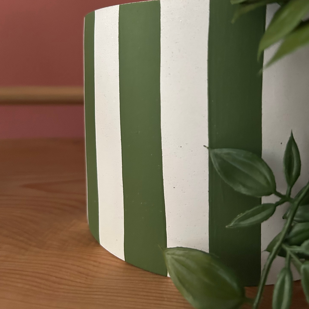 handmade planter using white marble jesmonite, this planter has a warm white and olive green stripe.
