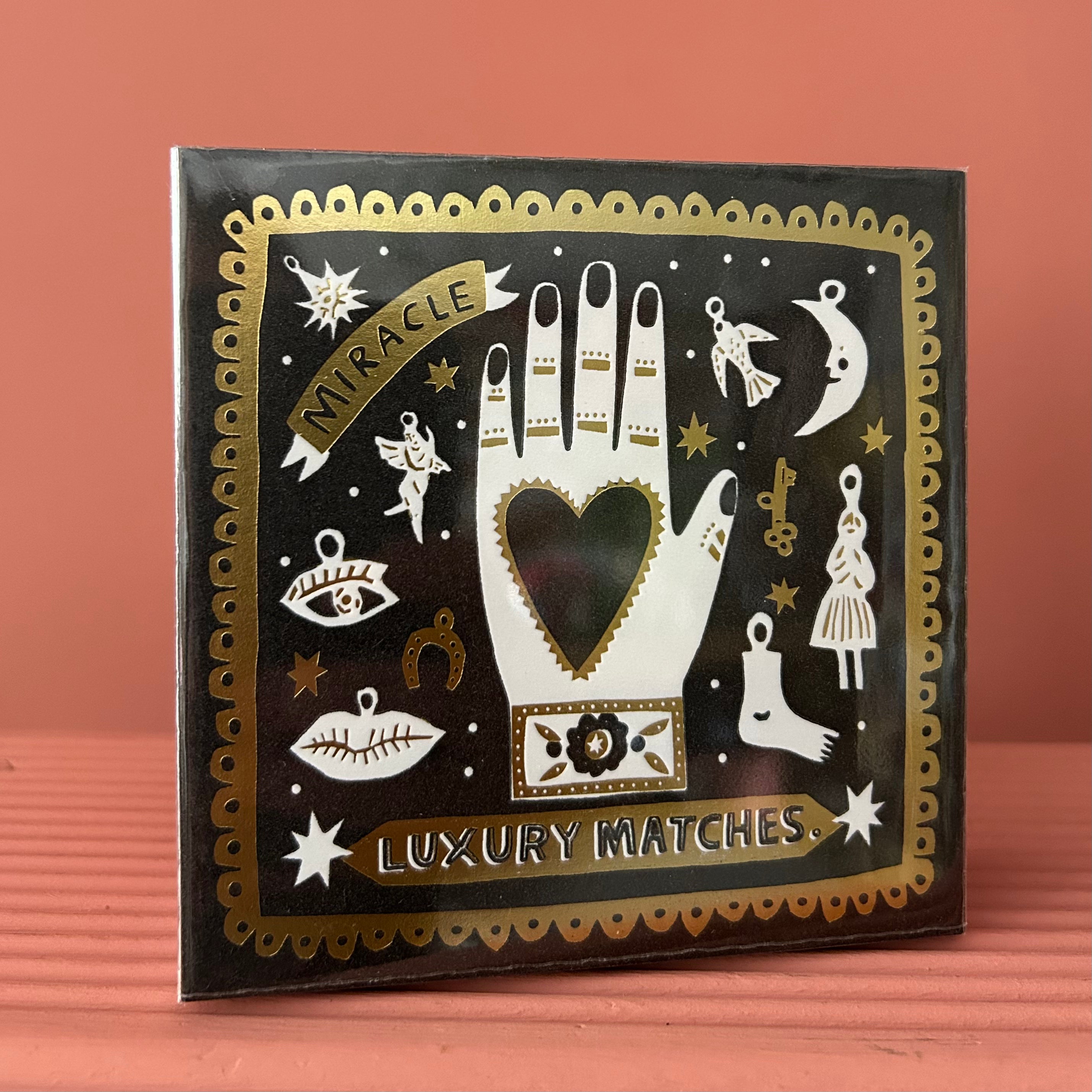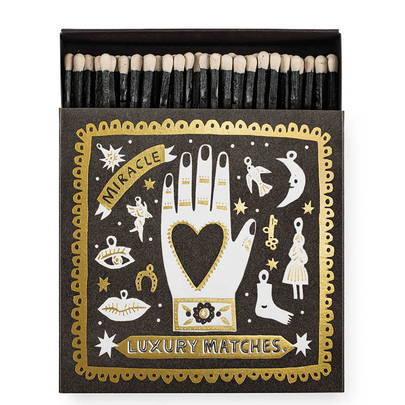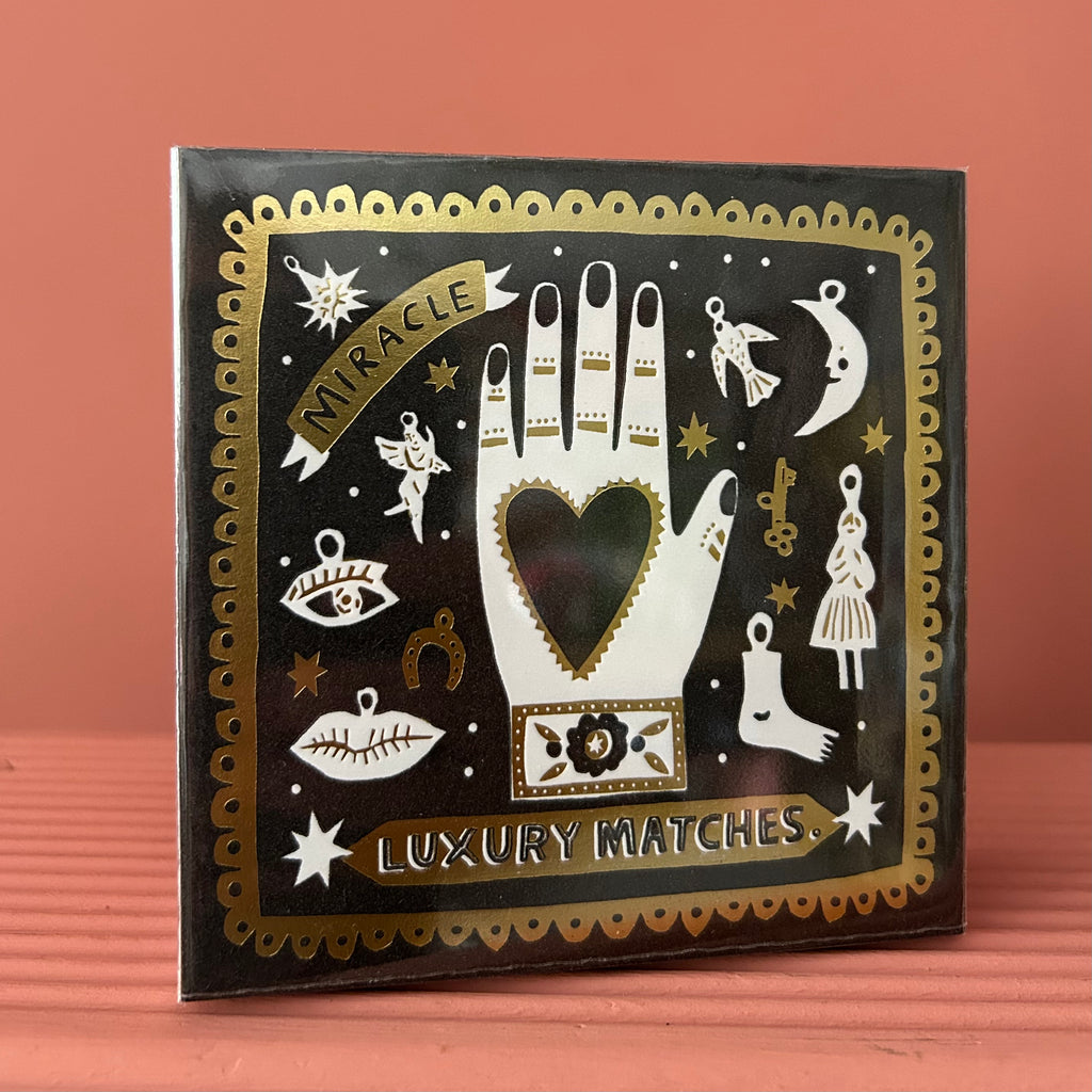 Containing 125 extra-long matches (all 100mm long), this matchbox draws inspiration from vintage print ephemera and the traditional “heart in hand” icon, a symbol of charity, craft, and heartfelt giving.
