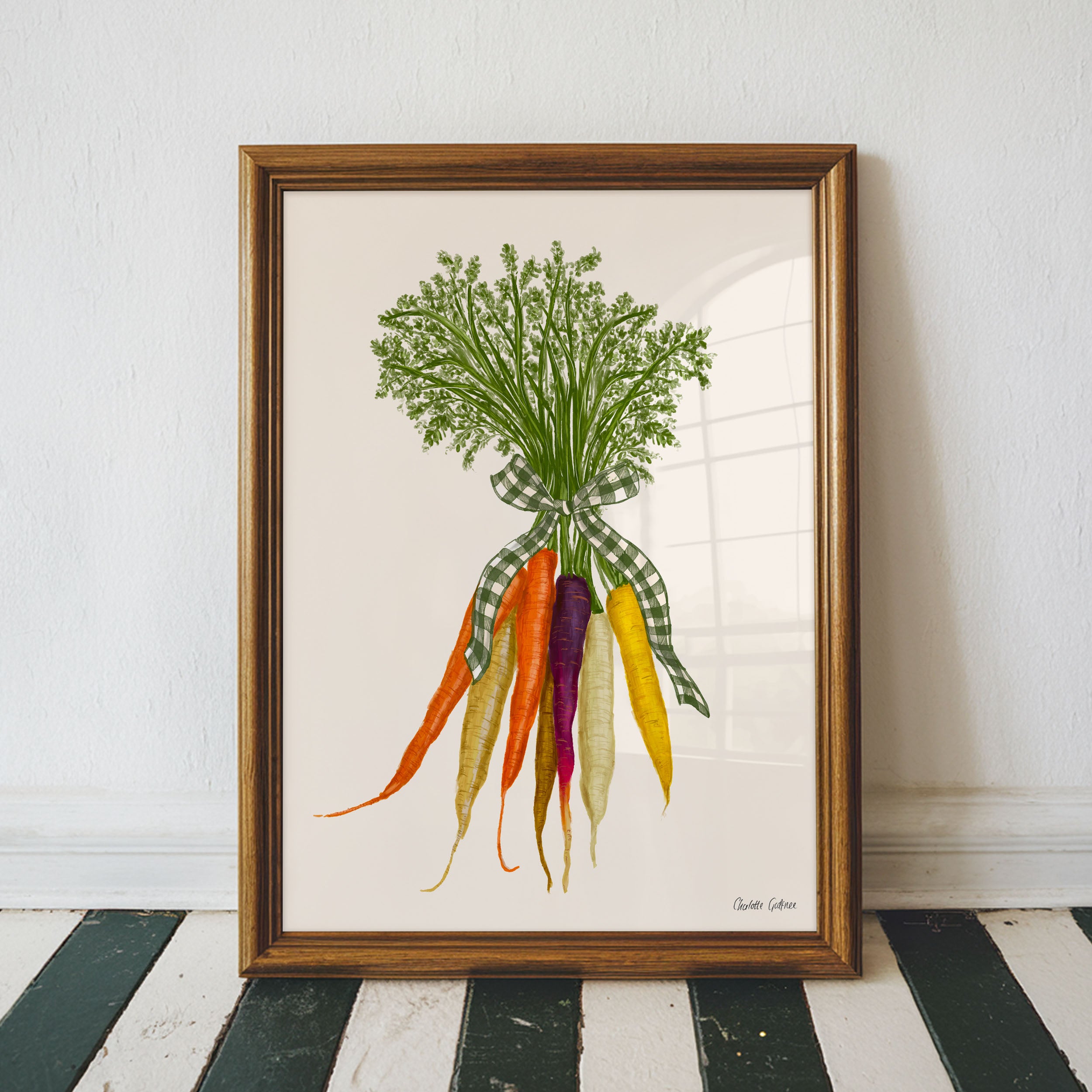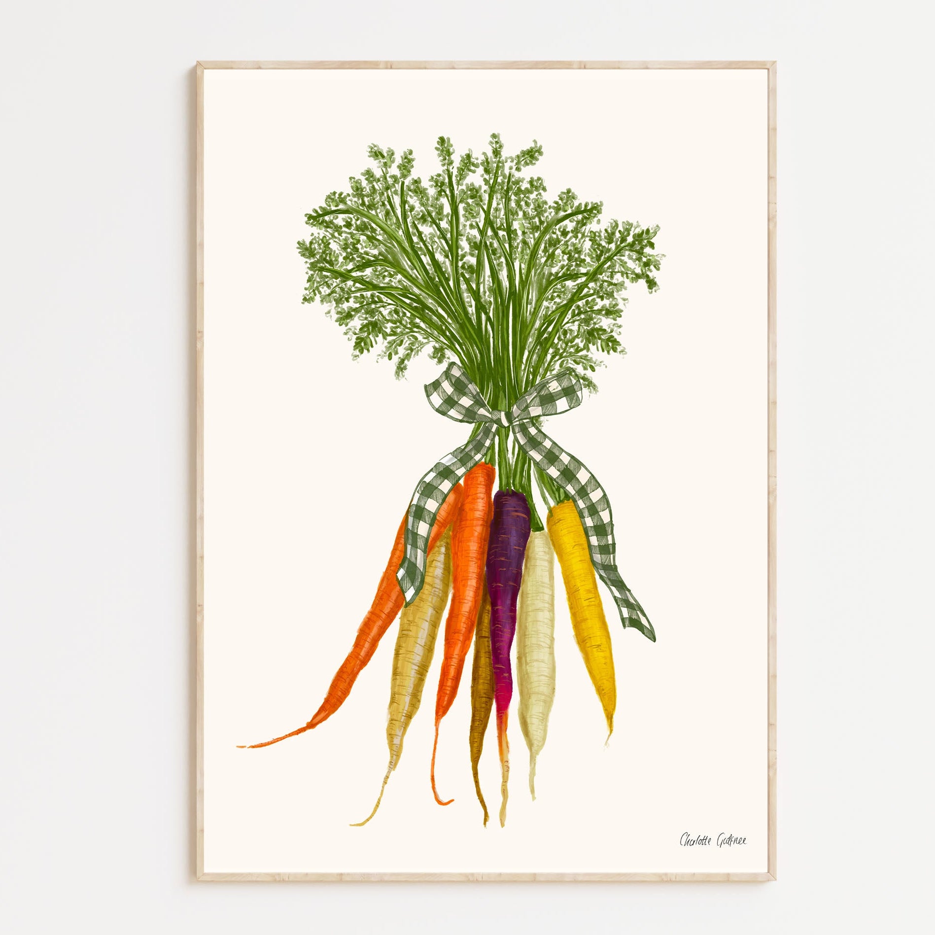A hand-drawn illustration of rainbow carrots tied with a gingham ribbon. This print is by illustrator Charlotte Godfree.