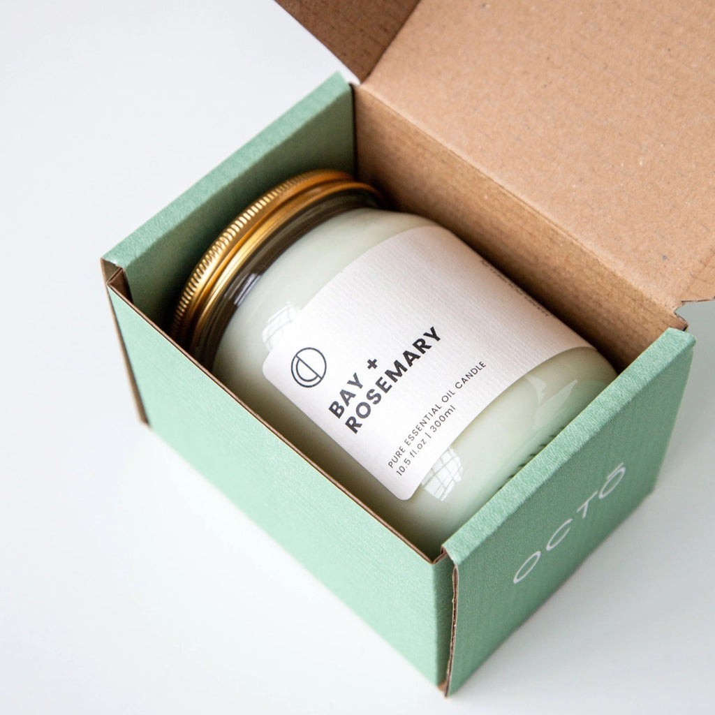 a hand poured bay and rosemary essential oil candle, made in the UK