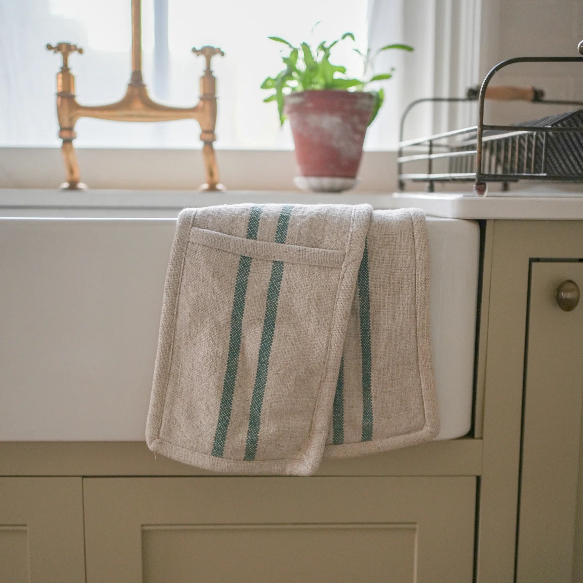 This oven glove has green stripe detail, and not only offers protection when handling hot pots and pans but also brings a touch of sophistication to the home.